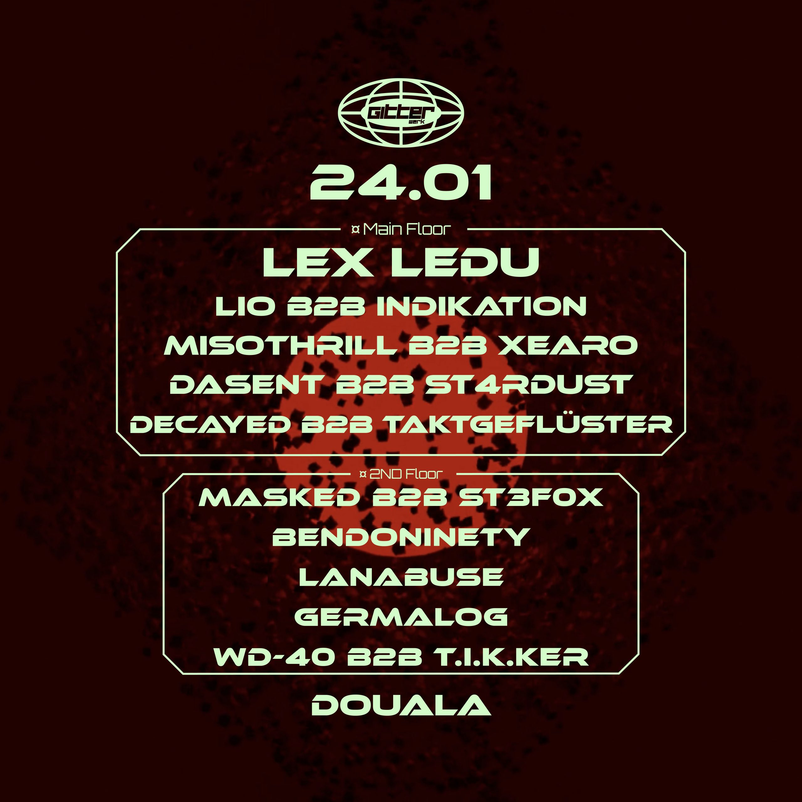 24.01.2026 LEX LEDU X GITTERWERK Boiler Room Session & LEX LEDU for the first time in Ravensburg! Main Floor B2B Support 2nd Floor Trance to Hard DOUALA RAVENSBURG